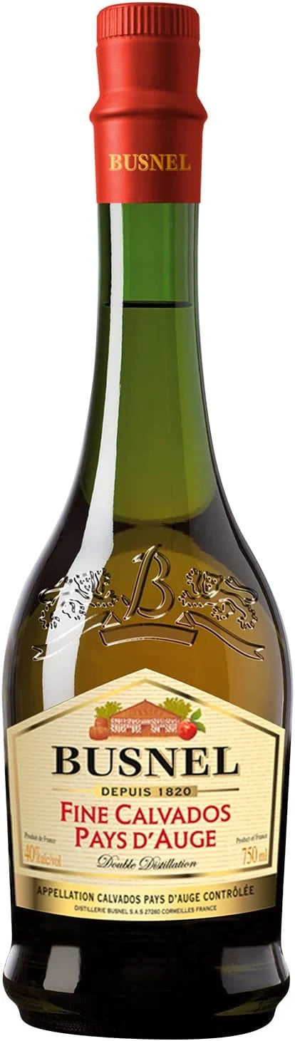 Busnel Calvados Pays d'Auge is an apple brandy from Normandy, France, aged for at least four years in oak barrels. It has a bright yellow color, fruity aromas, and a balanced palate with floral notes. The finish is long, persistent, and subtly woody.